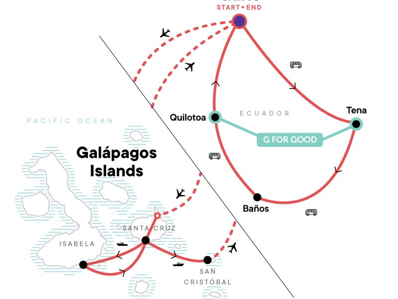 Your Big Night Out Moment: - San Cristóbal Island, San Cristóbal Island. Cacao and Chocolate Experience. Amazon Jungle Walk & Pimpilala Waterfalls Visit. Community Artisan Workshop Visit. Guayama Community Project Visit. La Carolina Park Orientation Walk. Interpretation Centre Visit (San Cristóbal Island). Snorkelling equipment and activity at Tijeretas (San Cristóbal). Concha de Perla snorkelling excursion. Hike to Sierra Negra volcano (Isabela Island). Charles Darwin Research Station (Santa Cruz Island). Isabela Municipal Tax. Opportunities for snorkelling, swimming, and incredible wildlife encounters. Internal flights. Free time in Tena, Baños, Quilotoa, & Quito. All transport between destinations and to/from included activities.