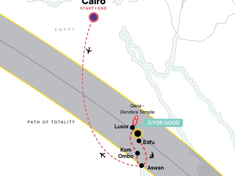 Your Welcome Moment: Welcome Moment - Meet Your CEO and Group. Great pyramid of King Khufu visit. Grand Egyptian Museum. Luxor Temple visit. Karnak Temple Visit. Valley of the Kings visit. Dandara Temple visit. Nile Cruise Solar Eclipse Viewing Party. Edfu Temple Visit. Philae Temple visit. Scenic Felucca ride on the Nile. Kom Ombo Temple visit. Free time in Aswan. Internal flight between Cairo and Aswan. All transport between destinations and to/from included activities.