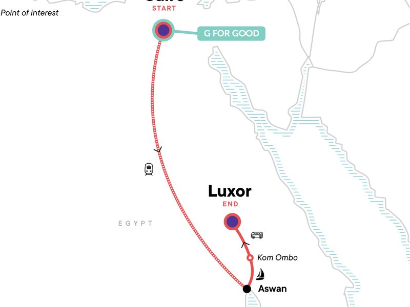 Your Local Living Moment: Lunch with a Local Family, Luxor. Complimentary arrival transfer. Visit to The Great Pyramids of Giza. Grand Egyptian Museum guided tour. Overnight train to Aswan. Philae temple by boat. Sail to a Nubia Family for a local meal. Free time in Aswan & Luxor. Ride a felucca to Kom Ombo temple. West Bank tour. Karnak temple. Funtasia Project. All transport between destinations and to/from included activities.