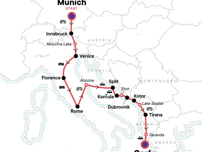 Hike in the Italian alps, Savour Italian cuisine in Rome, Hop on a boat to the island of Brač, Take a scenic drive along Kotor Bay, Take advantage of of free time in Corfu