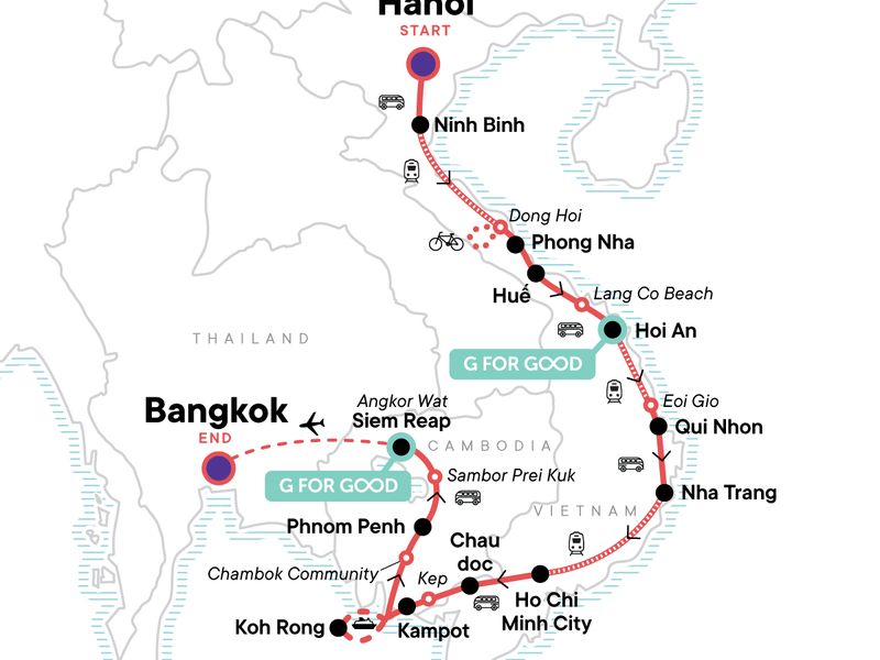 Your Foodie Moment: Street Food Dinner in Chinatown, Bangkok. Hanoi Foodie Culture Tour. Tam Chuc Pagoda Tour. Dong Hoi Wet/Fish Market tour and countryside cycling. Vinh Moc Tunnels Tour. An Bang Cemetery Tour. Visit Lang Co Beach. Hai Van Pass and Marble Mountain Tour. Hoi An Old Town Walk and Riverside Evening Out. Dinner at one of the stylish restaurants in the ancient town of Hoi An. Thap Doi Cham Temples Visit. Eoi Gio Coastal Walk. Beach Time at Qui Nhon and Nha Trang. Visit Gành Đá Dĩa. Ho Chi Minh City Walking Tour including Ben Thanh Market. Karaoke Night. Motorbike tour including Hang Pagoda and Sam Mountain. Chau Doc market. Kep market walk. Tour of Monivong Bokor NP. Tour of Chambok Community with traditional lunch. Phnom Penh cyclo tour and dinner at one of best restaurants in Phnom Penh. Visits to Skun Market and Santuk Silk Farm. Tour of Sambor Prei Kuk Ancient Site. Visit Rong Klua Market. Visit Wat Sothorn Wararam Woraviharn. Walk and night out on Khao San Road. All transport between destinations and to/from included activities.