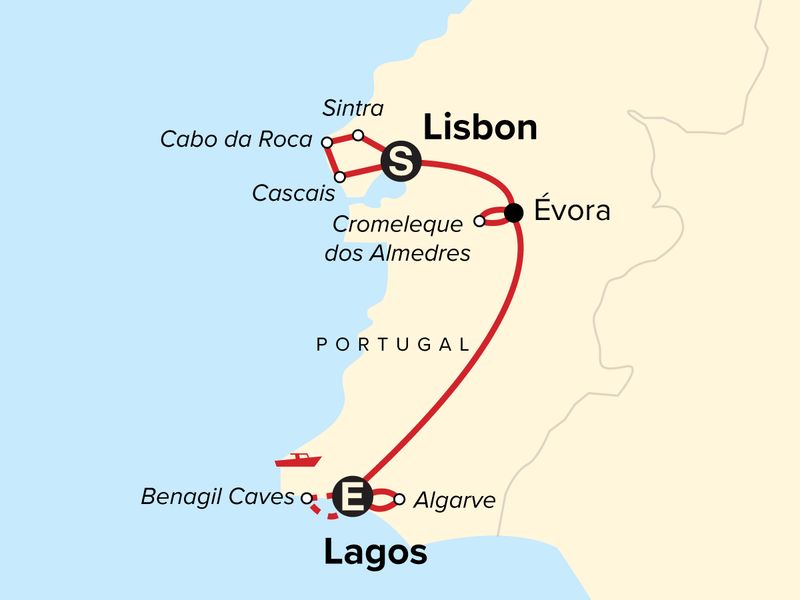 Your Family Journeys Moment: Lisbon Scavenger Hunt, Lisbon. Arrival transfer. Coastal bike tour. Cabo da Roca viewpoint and lighthouse visit, Cabo da Roca. Sintra visit and Pena Palace Guided tour Sintra. Orientation walk Evora with Chapel of Bones visit. Cromeleque dos Almendres Monoliths visit. Surf lesson or Ferragudo village and Pink Fort visit. Algarve boat tour with Benagil Caves. Local cooking class. All transport between destinations and to/from included activities