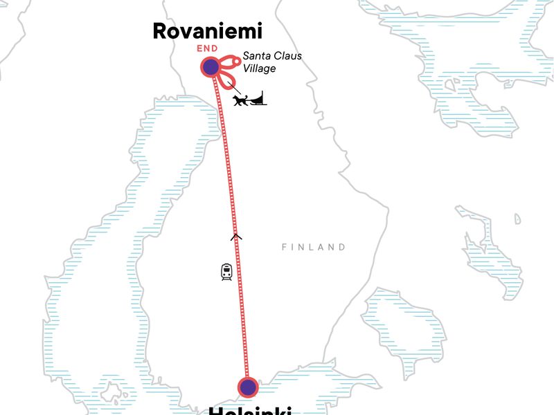Your Welcome Moment: Welcome Moment - Meet Your CEO and Group. Helsinki Orientation Walk. Helsinki Library Visit. Orientation Walk Rovaniemi. Kuoska Reindeer Farm and Husky Experience. CEO-led northern lights hunt. Visit Santa Claus Village and the Arctic Circle line. Campfire and northern lights experience. Choice of ice fishing or snowshoeing excursion. Handicraft demonstration. All transport between destinations and to/from included activities.