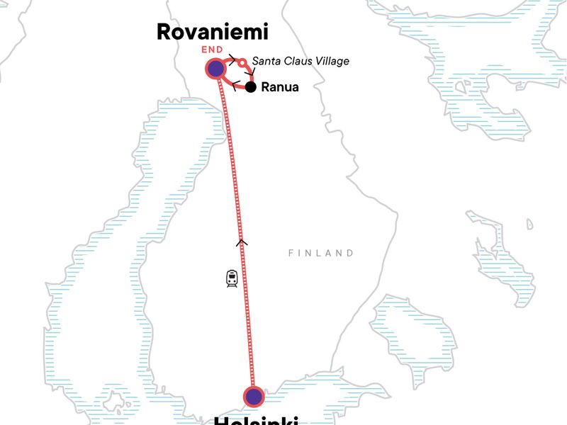Your Welcome Moment: Welcome Moment - Meet Your CEO and Group. Helsinki Orientation Walk. Helsinki Library Visit. Orientation Walk Rovaniemi. Kuoska Reindeer Farm and Husky Experience. Visit Santa Claus Village and the Arctic Circle line. Campfire experience under the midnight sun. Choice of fat tire e-bike ride or hike. Handicraft demonstration. All transport between destinations and to/from included activities.