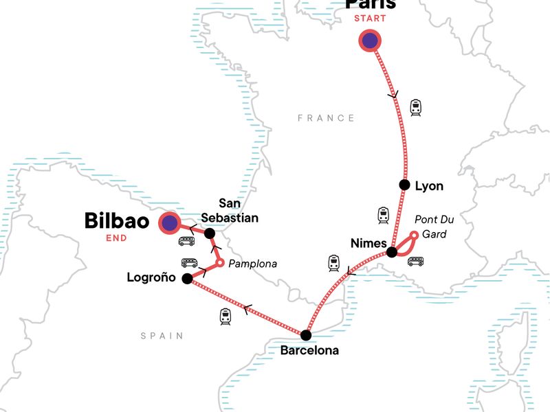 Your Foodie Moment: Pintxos (Tapas) Experience, Logroño. Paris-by-night orientation walk. CEO-led walking tour of Paris. Lyon walking tour. 48-hour Lyon metro card. Guided walking tour of Nîmes' Old City and Amphitheatre visit. Visit Pont Du Gard. Guided walking tour of Barcelona. 24-hour Barcelona metro ticket. Hike a portion of the Camino de Santiago from Obanos to Puente la Reina. Entrance and visit to the royal palace of Olite. Visit Pamplona. Orientation walks in San Sebastian and Bilbao. All transport between destinations and to/from included activities.