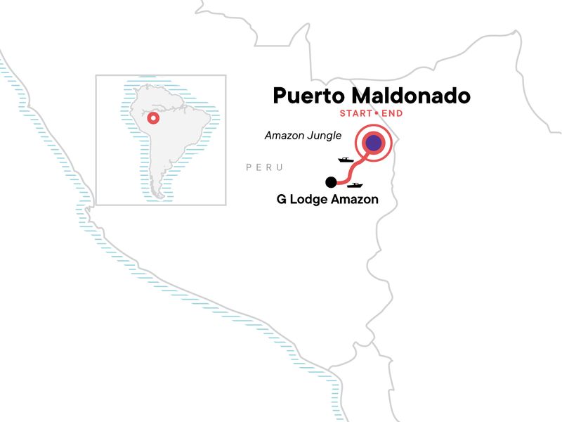 Head by private vehicle to the lodge's office in Puerto Maldonado to store large luggage. From there, travel about 1 hr to reach the boat landing.