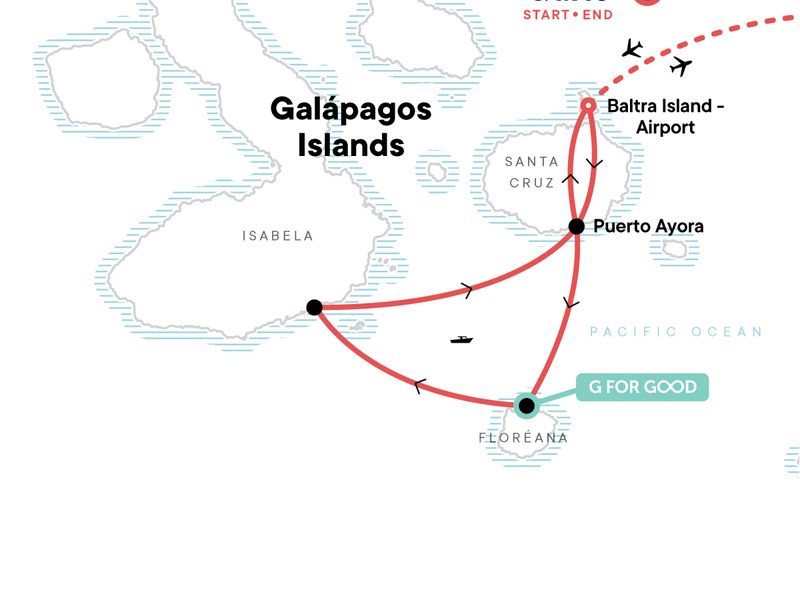 Your G for Good Moment: Floreana Community Guesthouse, Floreana Island. Charles Darwin Research Centre visit (Santa Cruz Island). Visit to Las Grietas. Flamingo Lagoon visit (Isabela Island). Sierra Negra volcano hike. Giant Tortoise Breeding Centre visit. Tortuga Bay hike (Santa Cruz Island). Internal flights. All transport between destinations and to/from included activities.