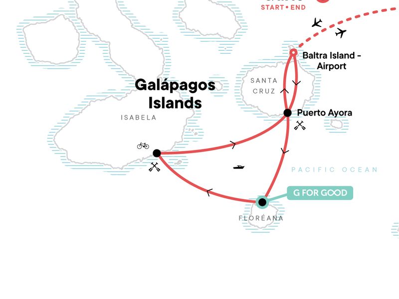 Your G for Good Moment: Floreana Community Guesthouse, Floreana Island. Visit to the Charles Darwin Research Station (Santa Cruz Island). Highlands and wild tortoise excursion. Snorkel excursion Tortuga Bay. Snorkelling at Black Beach and Loberia (Floreana Island). Biking excursion (Isabela Island). Sierra Negra Volcano hike. Giant Tortoise Breeding Centre visit. Internal flights. All transport between destinations and to/from included activities.