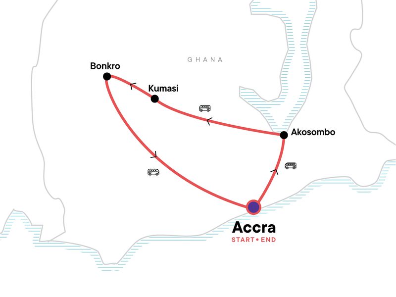 Your Foodie Moment: Bonkro Cooking Class Experience, Bonkro. Arrival transfer. Black Star Gate & Independence Square visit. Walking Tour of Jamestown. Kwame Nkrumah Mausoleum Visit. The Fantasy Coffins of Ghana. Shai Hills Reserve Visit. Krobo Village Beading Experience. Volta River Sunset Cruise. Climbing Mount Afadjato. Wli (Agumatsa) Falls Visit. Ntonso Adinkra Village Visit. Manhyia Palace Museum Visit. Akwasidae Festival in Kumasi. Commercial Centre of Kumasi Visit. Visit to Kuapa Kokoo Cooperative. Community Guesthouse Stay. Village Walk. Outdoor Movie Night with Locals in Bonkro. New Edubiase Market Visit. Bike ride back to Bonkro from New Edubiase. Visit to the Reforestation Project at Bonkro. Bonkro Community Bonfire. All transport between destinations and to/from included activities.