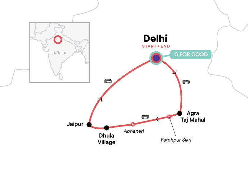 Arrival transfer included through the G Adventures-supported Women on Wheels project. Walking tour with a guide from the G Adventures-supported New Delhi Streetkids Project. Old Delhi walk with stops at the Jama Masjid, Gurduwara, Chandni Chowk, and Connaught Place. Agra Fort visit. Taj Mahal visit. Fatephur Sikri visit. Village stay (Dhula). I'timad-ud-daulah (Baby Taj) entrance. Jaipur City Palace entrance and guided tours. Amber Fort. Abhaneri village walk and stepwell visit. All transport between destinations and to/from included activities.