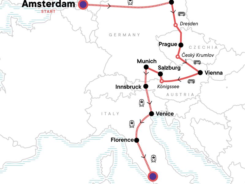 Your Foodie Moment: Florence Market and Food Tour, Florence. Cruise around the canals on a Bike tour in Amsterdam. Take a hike along a lake near Salzburg. Sample local brews with a beer tasting in Prague. Hike in the Italian alps along Lake Misurina. Explore Vienna on a walking tour. Learn of the local legends on a ghost tour in Venice. Try local delicacies on a market and food tour in Venice. Sample delicious local food in Florence and Rome. Free time in major cities throughout adventure. Transportation between all destinations. 24 hour metro pass in select cities.