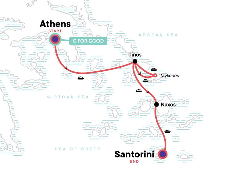 Me Day: Naxos Me Day, Naxos. Complimentary Arrival transfer. Sunset walk up Filopappou Hill. Day tour to Mykonos. Tinos hike. Free time in TInos and Naxos. Orientation walk in Naxos. Caldera walk in Santorini. All transport between destinations and to/from included activities.
