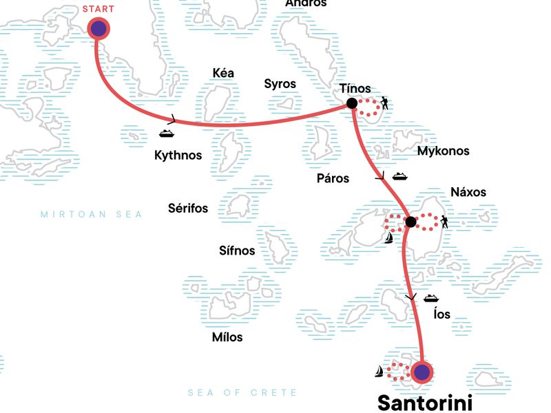 Your OMG Day: Crater Rim Hike or Santorini Driving Tour, Santorini. Food tour in Tinos Old Town. Hike village-to-viilage to Tinos Castle with local guide. Naxos cheese and wine trail food tour. Naxos village-to-village hike. Full-day catamaran sailing in the Aegean Sea. Sunset Cruise with dinner from Santorini. Farewell dinner. Tips for all included meals and activities, except for CEO and Porterage. Departure transfer. All transport between destinations and to/from included activities.
