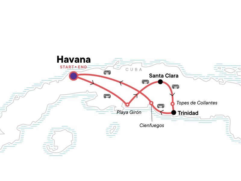 Your Local Living Moment: Havana Homestay, Havana. Arrival transfer. Bay of Pigs Museum. Lunch in Caleta Buena. Che Guevara monument and museum visit. Casa de Café visit and walk in Topes de Collantes National Park. Orientation walk in Trinidad. Salsa dancing lesson. Orientation walk in Cienfuegos. Panoramic bus tour of Havana. All transport between destinations and to/from included activities.