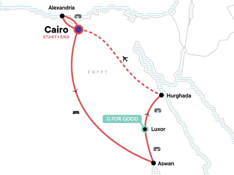 Your Discover Moment: Luxor. Pyramids of Giza and Sphinx entrance and guided tour. Grand Egyptian Museum entrance and guided tour. Felucca sailing excursion. Karnak and Kom Ombo temples entrance and guided tour. Cycle and Funtasia Project visit. Temple of Hatshepsut and Valley of the Kings guided visit. Colossi of Memnon visit. Alexandria guided tour. Boat and snorkelling trip in Hurghada. Internal flights. All transport between destinations and to/from included activities