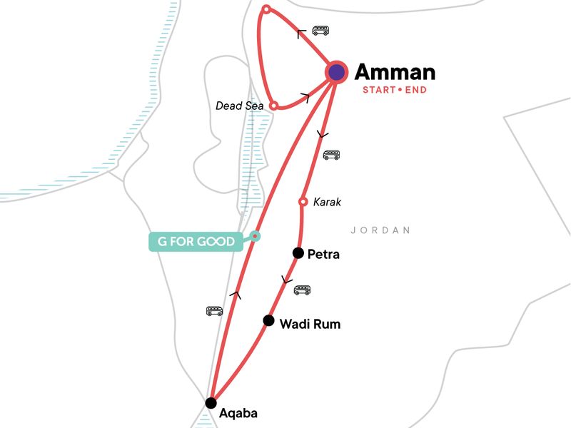 Your Local Living Moment: Bedouin Camp Overnight, Wadi Rum. Jerash guided tour. Dead Sea visit. Visit Madaba mosaics and Mt Nebo. Karak Castle guided tour. Petra guided tour. Wadi Rum 4x4 excursion. Red Sea stay. Entrance fees in all included tours. All transport between destinations and to/from included activities.