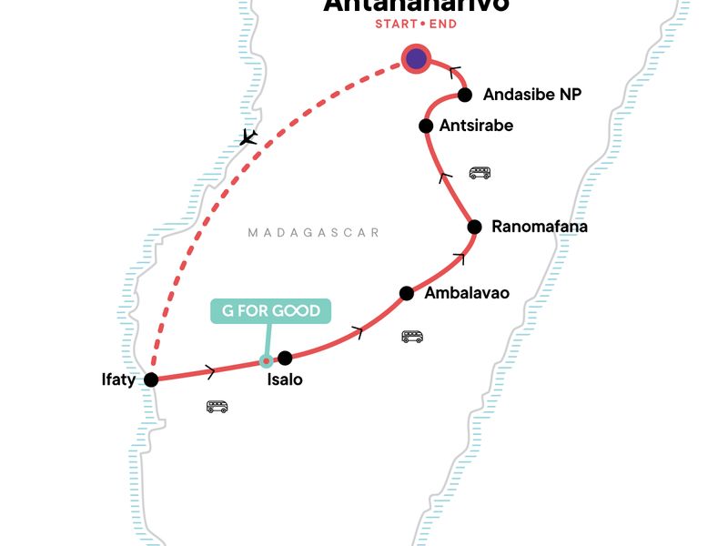 Your Discover Moment: Ifaty. Andasibe Indri Special Reserve guided walk. Paper Factory Visit. Anja Reserve walk. Isalo National Park visit. Walking Near Antsirabe. Andasibe-Perinet National Park Guided Walk. Free time in Ifaty. Internal flight. All transport between destinations and to/from included activities.