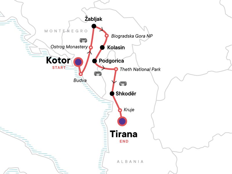Your Welcome Moment: Welcome Moment - Meet Your CEO and Group. Kotor orientation walk. Boat tour from Kotor to Perast. Budva Old Town walk. Visit Ostrog Monastery. Full-day excursion to Biogradska Gora National Park. Kolašin 4x4 Off-Road Excursion. Orientaion walk of Podgorica. Theth National Park visit. Walking tour of Shkoder. Walking tour of Kruje. Transport to/from all included activities and between all destinations.