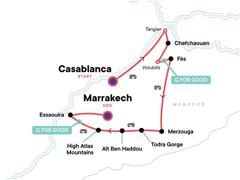 Your Discover Moment: Marrakech. Tangier guided tour including the medina, kasbah, and the grand and petit souks. Volubilis guided tour including Roman ruins. Fès medina guided tour including artisans' quarter and Fès tannery. Sunset camel ride in the desert. Todra Gorge stay with walk through local villages. Aït Ben Haddou kasbah tour. High Atlas Mountains hike. Marrakech medina guided walk of souks and Jemaa el-Fnaa square. All transport between destinations and to/from included activities.