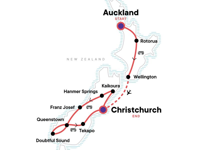 Your Discover Moment: Queenstown. Waitomo Glowworm caves visit. Orientation walk in Wellington and Christchurch. Wine tasting. Fiordland National Park visit with Doubtful Sound day cruise. Aoraki/Mt Cook National Park visit with hiking opportunity (weather permitting). Internal flight between Wellington and Christchurch. Free time in Rotorua, Wellington, Franz Josef, and Queenstown. All transport between destinations and to/from included activities.