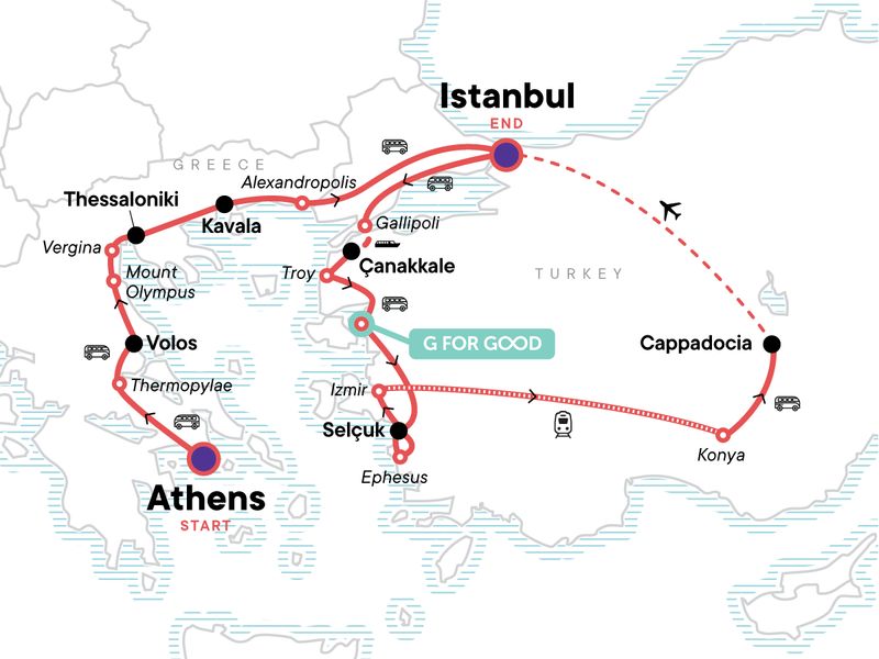 Your Local Living Moment: Dinner with Local Family, Çavuşin. Visit Thermopylae Battleground Site and Information Centre. Volos Orientation Walk. Full-day village-hopping tour from Vilos. Hike to centaur cave from Milies, Visit a women's coop in Vizitsa. Visit Pinakates, Agios Georgios and beach time at Kato Gatzea. Walk in Mount Olympus National Park. Polycentric Museum of Aigai. Thessaloniki Orientation Walk. Walking exploration of Kavala's old town. Alexandroupoli orientation walk. Istanbul evening orientation walk. Gallipoli battlefields entrance and guided visit. Troy entrance and guided visit. Ephesus entrance and visit. Orientation walk in the old Kemeralti bazaar in Izmir. Tour the Mevlana Museum. Tea at sunset from a viewpoint over Cappadocia. Hike through the "fairy chimneys" of Cappadocia. Kaymakli underground city exploration. Internal flight. All transport between destinations and to/from included activities
