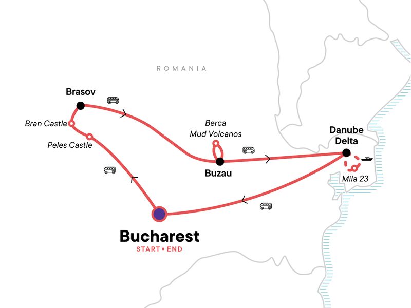 Your Welcome Moment: Welcome Moment - Meet Your CEO and Group. Visit the town of Sinaia. Bran Castle entrance ticket. Free time in Brasov. Visit to the Berca Mud Volcanoes. CEO-led orientation walk in Mila 23. Full-day guided tour of the Danube Delta by speedboat. All transport between destinations and to/from included activities