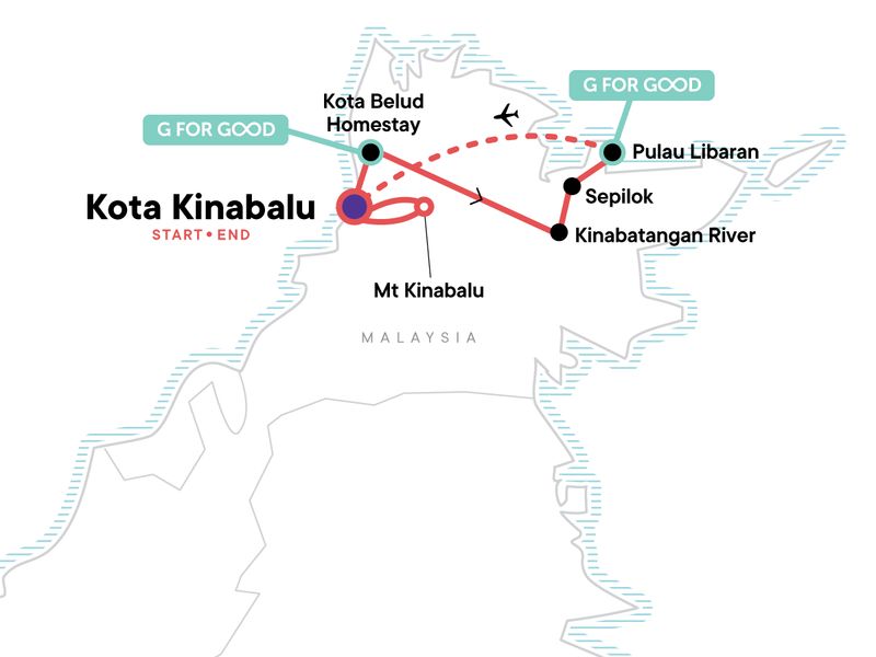Your Foodie Moment: Local Farms and Cooking Demonstration, Tambatuon Village. Morning and evening Kinabatangan River safaris. Guided oxbow lake visit and wildlife spotting (Kinabatangan). Sepilok Orangutan Rehabilitation Centre visit. Turtle Island stay with turtle hatchery visit. Bornean Sun Bear Conservation Centre Visit. Mt Kinabalu hike (2 days). Internal flight. All transport between destinations and to/from included activities.
