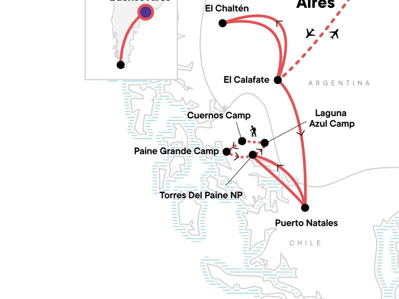 Your Welcome Moment: Welcome Moment - Meet Your CEO and Group. Laguna de los Tres full-day guided hike (El Chaltén). Loma del Pliegue Tumbado Guided Hike. Perito Moreno Glacier guided tour (El Calafate). Torres del Paine NP excursion with porters (3 nts). W Trek. Internal flights. All transport between destinations and to/from included activities.