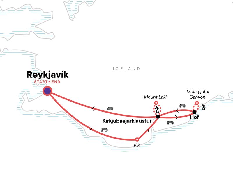 Your Welcome Moment: Welcome Moment - Meet Your CEO and Group. Seljalandsfoss waterfall visit. Hike to Skógafoss waterfall. Hike along Jokulsarlon glacial lagoon. Skaftafell nature reserve visit. Múlagljúfur Canyon hike. Glacier explorer activity with hike. Fjaðrárgljúfur Canyon hike. Mt Laki hike. Stop at Systrafoss, Systrastapi, and Kirkjugólf waterfalls. Vatnajökull National Park visit with hikes to waterfalls and up volcanos. All transport between destinations and to/from included activities.