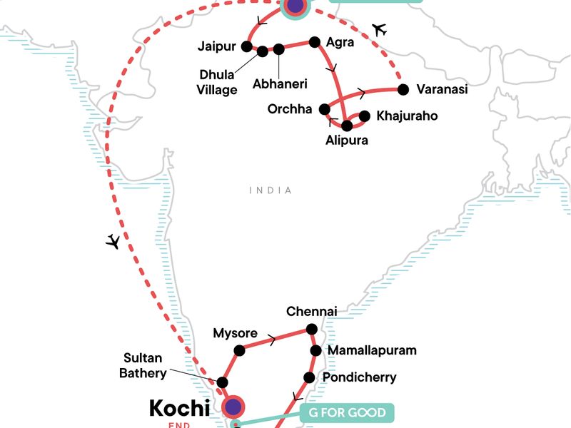 Your Local Living Moment: Kerala Backwaters Homestay, Alleppey. Old Delhi walk. Amber Fort tour. Rajasthani rural village stay. Dhula Village cycling excursion. Taj Mahal, Baby Taj and Agra Fort tour. Orchha Palace complex visit. Western Temple complex visit. Ganges River boat trips at sunrise and sunset, including candle flower ceremony. Fort Kochi orientation walk. Wayanad Tea Plantation and Factory visit. Chaumundi Temple and Mysore Palace visit. Mamallapuram Shore Temple visit. Pondicherry orientation walk. Madurai cycle-rickshaw ride and Sri Meenakshi temple visit. Cardamom Hills spice plantation tour. Internal flights. All transport between destinations and to/from included activities.