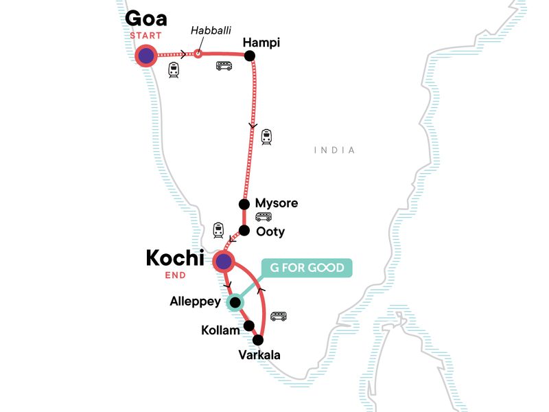 Your Big Night Out Moment: Kochi Nightlife, Kochi. Hampi Ruins Walking Tour. Anjaneya Temple Sunset. Devaraja Market Visit. Chamundi Hills Visit. Monolithic Bull Visit. Dodapetta Peak. Dodapetta Tea Factory. Fort Kochi Visit. Free time in Hampi. Free time in Ooty. Orientation walks in Alleppey, Kollam, and Fort Kochi. Morning ferry cruise on Alleppey's backwaters. All transport between destinations and to/from included activities.