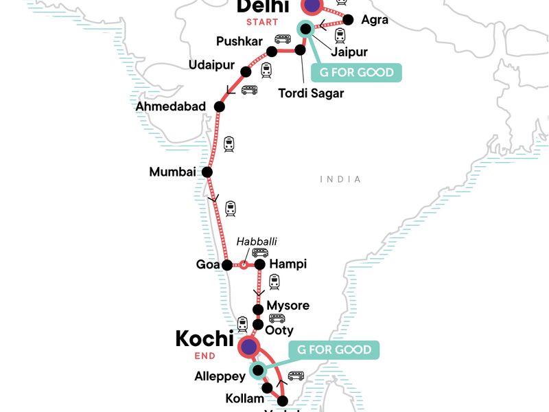 Your Big Night Out Moment: Kochi Nightlife, Kochi. Guided tour of the Taj Mahal and the Amber Fort. Orientation walks in Jaipur, Pushkar, Udaipur, and Mumbai. Visit to Gandhi Ashram. Village walk in rural Tordi Sagar. Sunrise at Savitri temple. Free time in Hampi, Ooty. Hampi Ruins Walking Tour. Anjaneya Temple Sunset. Devaraja Market Visit. Chamundi Hills Visit. Monolithic Bull Visit. Dodapetta Peak. Dodapetta Tea Factory. Fort Kochi Visit. Orientation walks in Alleppey, Kollam, and Fort Kochi. Morning ferry cruise on Alleppey's backwaters. All transport between destinations and to/from included activities.