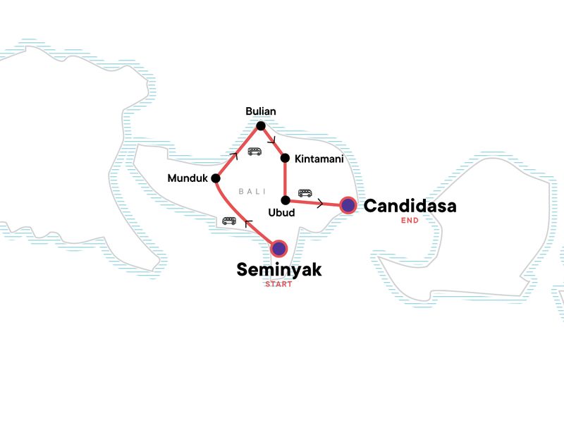 Your Discover Moment: Ubud. Jatiluwih Rice Terraces Visit. Ulun Danu Temple Complex Visit. Banjar Hot Springs. Singaraja Traditional Market. Beji Temple. Bulian Village Tour. Lemukih Village Trek. Free time in Mt Batur. Penglipuran Village Visit. Pura Gunung Kawi Sebatu Temple. Free time in Ubud. Free time in Candidasa. Transport to/from included activities.