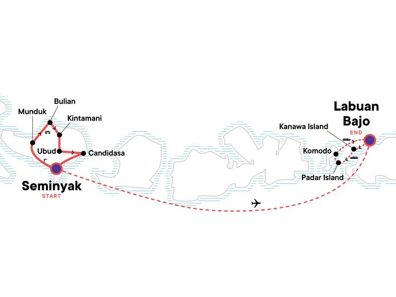 Your Discover Moment: Ubud. Jatiluwih Rice Terraces Visit. Ulun Danu Temple Complex Visit. Banjar Hot Springs. Singaraja Traditional Market. Beji Temple. Bulian Village Tour. Lemukih Village Trek. Free time in Mt Batur. Penglipuran Village Visit. Pura Gunung Kawi Sebatu Temple. Free time in Ubud. Free time in Candidasa. Komodo Dragon Trekking. Pink Beach. Taka Makassar. Snorkel at Manta Point. Kanawa Islands. Padar Island. Manjerite Island. Kelor Island. Rinca Island Komodo Dragon Hike. Free time in Ubud. Free time in Labuan Bajo. Transport to/from included activities. Internal airfare.