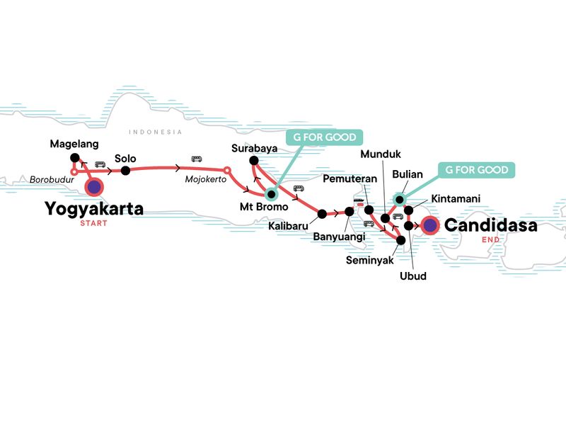 Visit one of Bali's most famous temples Tanah Lot, Witness spectacular sunrises over Ijen Volcano and Mt Bromo, Get hands on at a batik making experience, Rest and relax in the Banjar Hot Springs, Visit the picturesque Ulun Dano Temple, Visit the G for Good supported community in Bulian, Chill out in Candidasa with some beach time