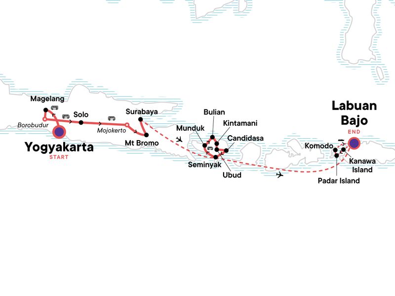 Your Discover Moment: Ubud. Candirejo Village Visit. Setumbu Hill Sunrise Hike. Wanurejo & Borobudur Village Biking Tour. Mangkunegaran Palace Visit. Triwindhu Market. Traditional Batik Making. Jodipan Colorful Village Visit. Mount Bromo Jeep Excursion. Ngadas Village Walk. Lunch at Ngadas Village. Free time in Yogyakarta & Ngadas. Komodo Dragon Trekking. Pink Beach. Taka Makassar. Snorkel at Manta Point. Kanawa Islands. Padar Island. Manjerite Island. Kelor Island. Rinca Island Komodo Dragon Hike. Jatiluwih Rice Terraces Visit. Ulun Danu Temple Complex Visit. Banjar Hot Springs. Singaraja Traditional Market. Beji Temple. Bulian Village Tour. Lemukih Village Trek. Free time in Mt Batur. Penglipuran Village Visit. Pura Gunung Kawi Sebatu Temple. Free time in Ubud. Free time in Candidasa. Transport to/from included activities.