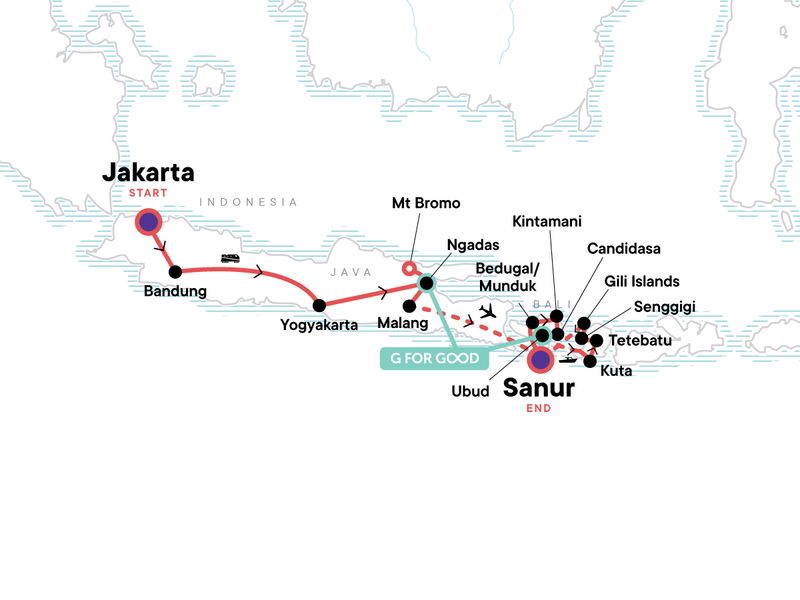 Your Discover Moment: Ubud. Jakarta city tour. Prambanan temple complex visit. Borobudur visit. Mt Bromo sunrise visit. Beach time in Sanur. Jatiluwih Rice Terraces visit (UNESCO-protected). Lake Bratan temple visit. Highlands of Kintamani visit. Mt Batur view. Local Indonesian meal experience. Kerta Gosa visit. Ubud orientation walk. Sasak village visit. Snorkelling trip. Easy trekking in Tetebatu. Sendang Gila Waterfall swim. Free time on the white-sand beaches of the Gili Islands. Internal flight. All transport between destinations and to/from included activities.