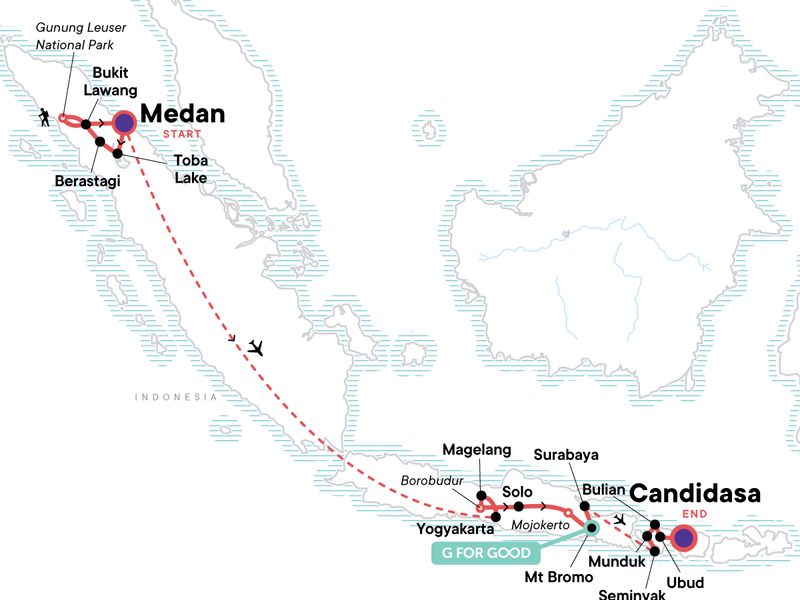 Orangutan Trekking in Gunung Leuser National Park, Visit Lake Toba the world's largest volcanic lake, Explore Samosir Island, Enjoy a guided tour of local indigenous Batak Village, Adventure through Sumatra's biggest city Medan, Adventure through Central Java, Experience local life on a biking tour through Wanjurejo and Borobudur Villages, Support a community tourism enterprise in Candijero village, Overnight in a G Adventures supported community homestay, Take a thrilling jeep ride through Mount Bromo during sunrise, Rest and relax in the Banjar Hot Springs, Visit the picturesque Ulun Dano Temple, Visit the G for Good supported community in Bulian, Chill out in Candidasa with some beach time