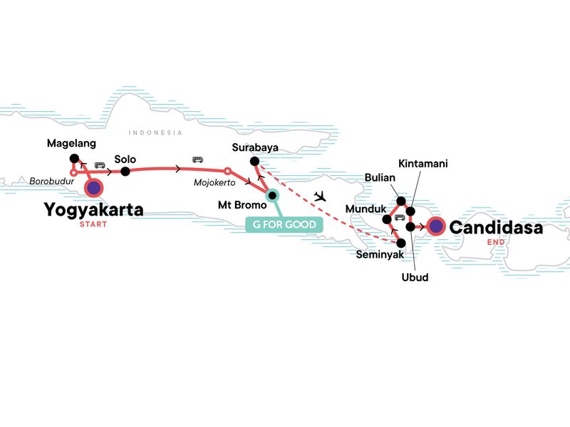 Adventure through Central Java, Experience local life on a biking tour through Wanjurejo and Borobudur Villages, Support a community tourism enterprise in Candijero village, Overnight in a G Adventures supported community homestay, Take a thrilling jeep ride through Mount Bromo during sunrise, Rest and relax in the Banjar Hot Springs, Visit the picturesque Ulun Dano Temple, Visit the G for Good supported community in Bulian, Chill out in Candidasa with some beach time