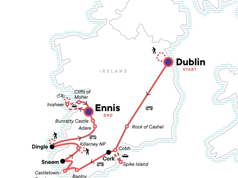 Your Local Living Moment: Tea & Scones, Inisheer. Complimentary arrival transfer. Welcome dinner with live music. Hike the Howth coastal loop from Dublin. Visit the Rock of Cashel. Guided tour of Spike Island with a storyteller. Visit the villages of Bantry, Glengarriff, Casteltown-Bearhaven and Eyeries along the Beara Peninsula. Seashore walk along the Kenmare Bay with a local expert. Lunch at Tom Crean's Brewery. Visit the Muckross House. Hike to the Torc Waterfall in Killarney National Park. Drive along the stunning Slea Head Drive, part of the Ring of Kerry. Hike the Hike Lub na Cille coastal trail with a local guide. Visit Adare and Bunratty Castle & Folk Park. Bicycle tour of Inisheer Island. Visit the Cliffs of Moher with a local guide. Farewell dinner with live music. All tips included for activities and meals, except for CEO and porterage. All transport between destinations and to/from included activities