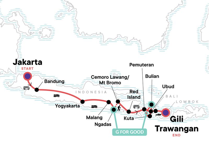 Your Big Night Out Moment: Beach Celebration, Gili Trawangan. Orientation walk in Bandung. Entrance to Bromo Tengger Semeru NP. Mt Bromo crater walk. Sunrise hike to Mt Bromo viewpoint. Cooking class (Kubutambahan). Gitgit waterfall visit. Monkey Forest visit. All transport between destinations and to/from included activities.