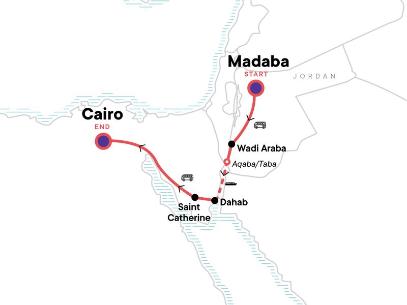 Egypt’s Sinai Peninsula is a land of stark beauty, deep history, and wild adventure — a true crossroads of ancient empires. If you’re craving something off the beaten path, this eight-day journey through lesser-known Jordan and the rugged Sinai is exactly what you need. Start in Madaba, home to the oldest surviving map of the Holy Land, then take a thrilling 4x4 ride through the dramatic dunes of Wadi Araba. Cross the Gulf of Aqaba to Dahab, a laid-back coastal haven with chances for world-class optional snorkelling in the famous Blue Hole. Then, step into history at Saint Catherine, the world’s oldest active Christian monastery, before hiking to the summit of Mount Sinai — where legend says Moses received the Ten Commandments. From vast deserts to sacred sites, this trip is made for travellers ready to push their boundaries and experience something extraordinary.