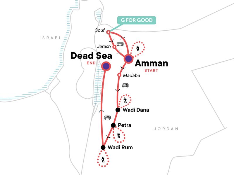 Wander the ancient ruins of Jerash, Hike along the ancient back-trail into Petra from little Petra and enjoy a second early morning sunrise visit, Take a jeep tour of the desert in Wadi Rum and enjoy a sunset hike, Hike to a waterfall and soak in the Dead Sea, Eat delicious traditional meals prepared by the communities visited.
