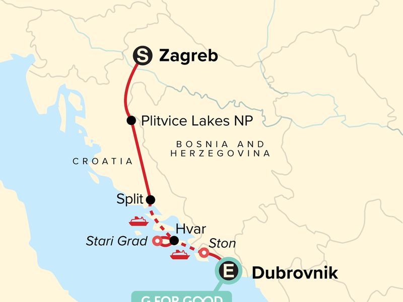 Your Welcome Moment: Welcome Moment - Meet Your Expedition Leader and Group. Plitvice National Parks walk. Split guided walking tour. Hvar guided walking tour. Stari Grad guided walking tour. Malo Grablje walk. Ston walk with oyster and wine tasting. Self guided Red History Museum visit. All transport between destinations and to/from included activities
