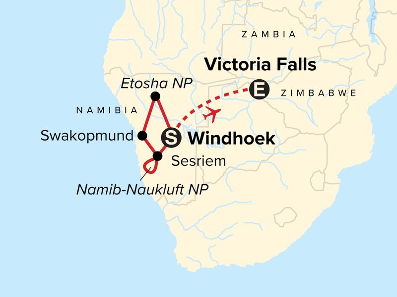 Your Discover Moment: Swakopmund. Arrival transfer. Sossusvlei desert excursion. Desert excursion with a local. Sandwich Harbour & Skeleton Coast Excursion. Full-day open-vehicle wildlife safari drive in Etosha. Tour of Victoria Falls. All transport between destinations and to/from included activities.