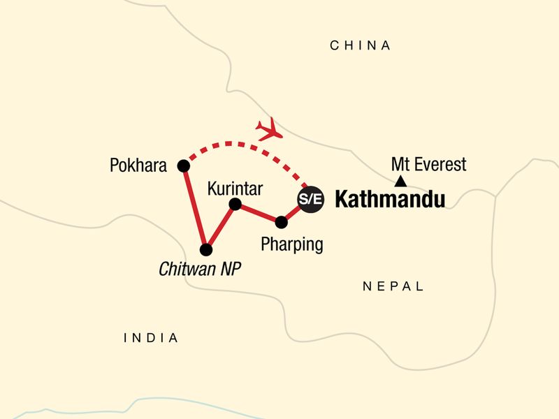 Your Welcome Moment: Welcome Moment - Meet Your Expedition Leader and Group. Arrival transfer. Sound bath wellness experience and six-course vegetarian Nepalese dinner. Visit Boudhanath Stupa and the Royal City of Bhaktapur. Visit Swayambhunath. Chitwan National Park including a village walking tour and jeep safari. Hike to the World Peace Pagoda. All transport between destinations and to/from included activities