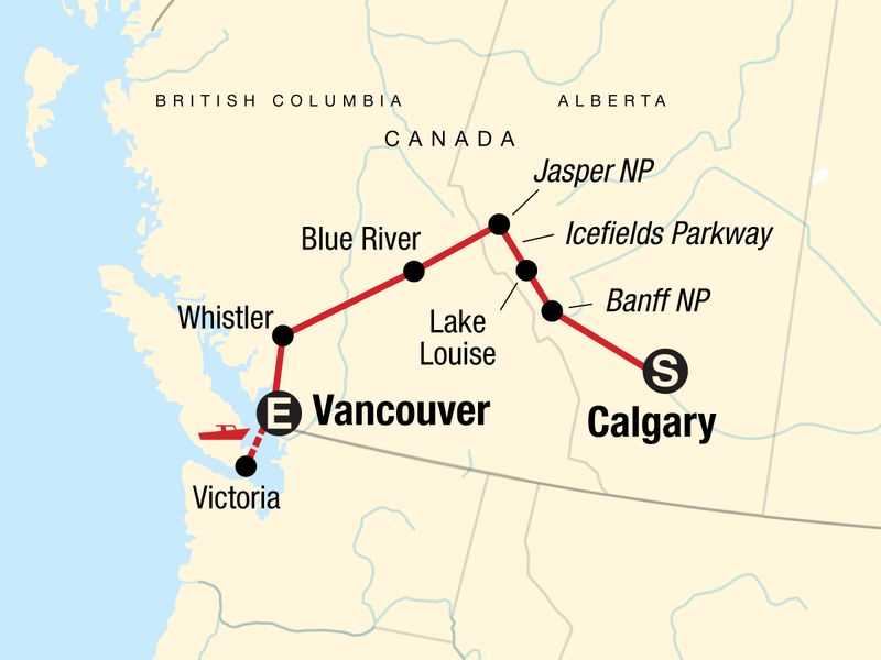 Your Wellness Moment: Miette Hot Springs Visit, Jasper National Park. All park fees in Jasper and Banff National Parks. Scenic ferry to Vancouver Island. Vancouver, Calgary, Victoria, Whistler, and Banff orientation walks. River float tour. Stops at Kamloops Lake and Seton Lake. Mount Robson Visitor Centre stop. Excursion to the Columbia Icefields and ice walk on the Athabasca Glacier. All transport between destinations and to/from included activities