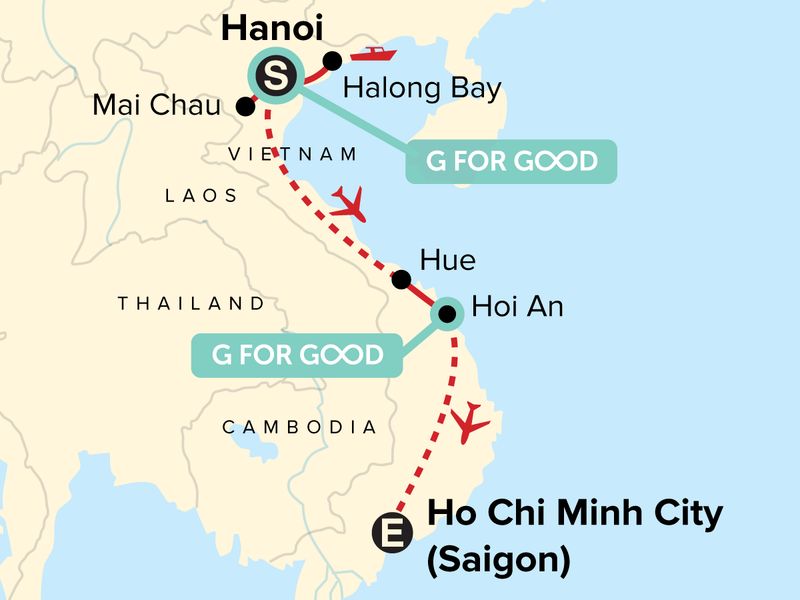 Your Discover Moment: Kym Viet Craft & Lunch, Hanoi. Arrival transfer. Visit Hoa Lo Prison (Hanoi Hilton) and Ho Chi Minh Mausoleum. Mai Chau Countryside Hike. Cyclo tour of Hanoi's Old Quarter. Overnight on a junk boat on Halong Bay. Guided tour of Emperor's Tomb and Imperial Citadel Hue. Lunch at a Buddhist Nunnery. Walking tour of Hoi An Old Town. Guided tour of the Cu Chi Tunnels. Internal flights. All transport between destinations and to/from included activities