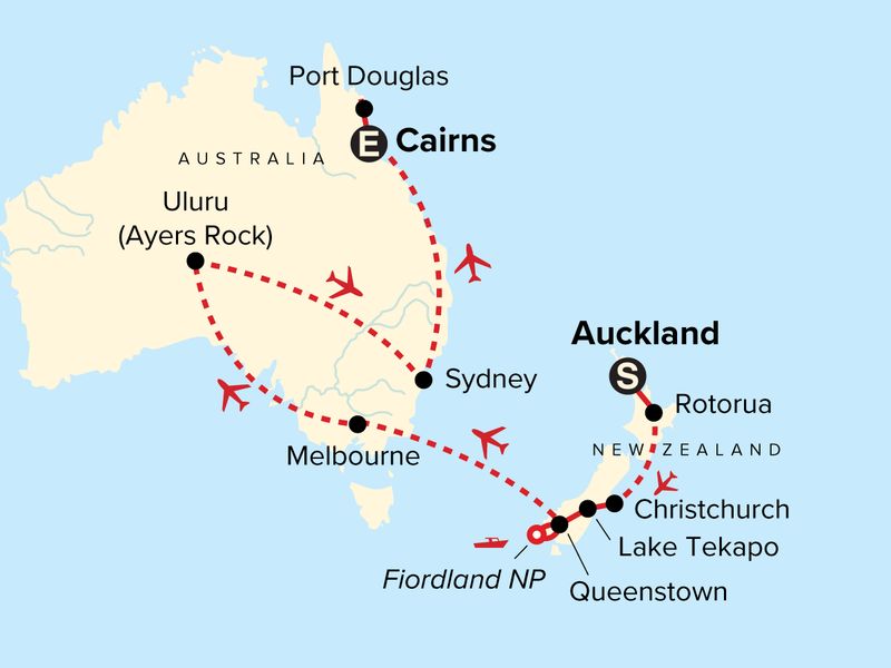 Your Welcome Moment: Welcome Moment - Meet Your Expedition Leader and Group. Waiheke Island Wineries. Waitomo Caves tour. Kohutapu Local Maori Community Initiative. National Kiwi Hatchery. Scenic TranzAlpine train. Sir Edmund Hillary Alpine Centre. Aoraki Mount Cook Kea Point Trek. Free time in Wanaka and Arrowtown. Wilderness day cruise in Fiordland National Park. Free time in Queenstown. Internal flight. All transport between destinations and to/from included activities. Melbourne Foodie Experience. Sunrise interpretive walk at Uluru. Sydney Harbour dinner cruise. Indigenous Peoples Interpretive Walk in the Daintree Forest. Great Barrier Reef Excursion. Exclusive Indigenous experience at Cooya Beach. Internal flights. All transport between destinations and to/from included activities.