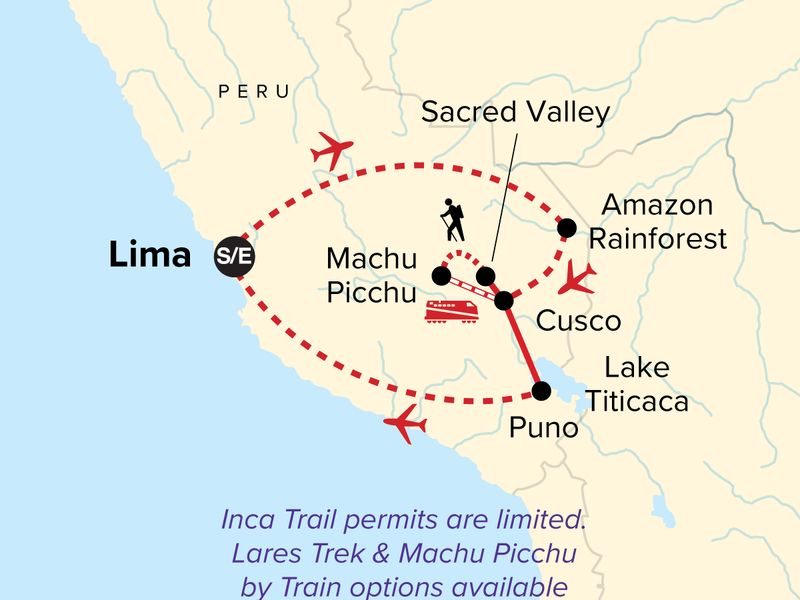 Your Discover Moment: Cusco. Arrival transfer. Three-day (2 nts) excursion to the intimate G Adventures rainforest lodge. Sacred Valley tour including Pisac and Ollantaytambo ruins. Choice of four-day Inca Trail hike with local guide, cook and porters, or Cusco/Aguas Calientes stay with scenic train. Guided tour of Machu Picchu. Guided tour of Taquile and Uros Islands on Lake Titicaca. Internal flights. All transport between destinations and to/from included activities.